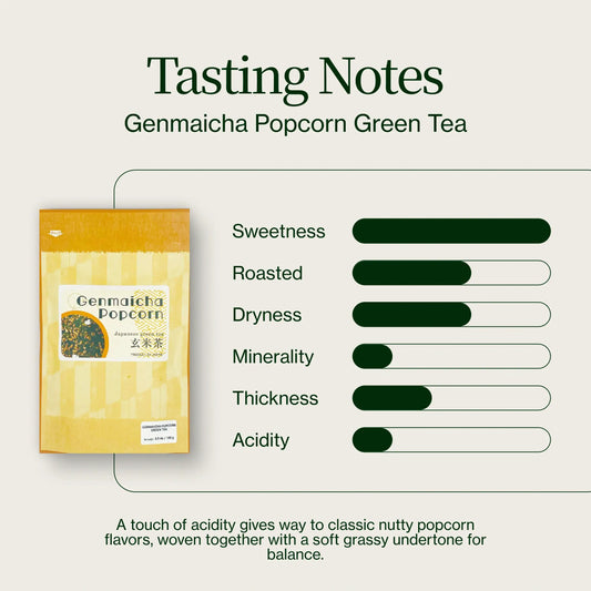 Genmaicha plays on more of these warm cereal notes, with a flavor like oatmeal or corn flakes. There is a light, starchy sweetness to the tea followed by some more grassy notes, depending on the type of tea leaves being used.