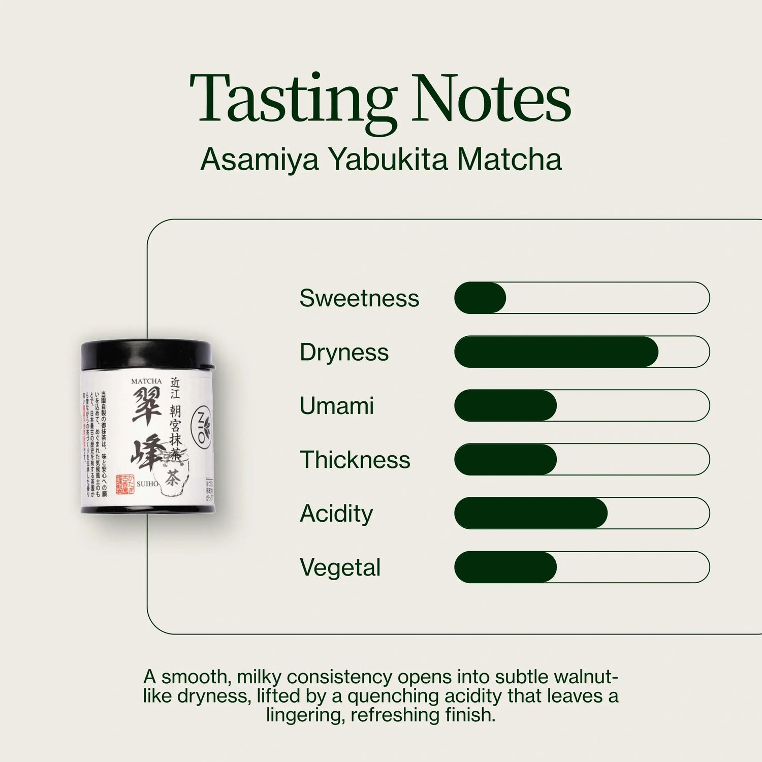 To assess the Asamiya Sayamamidori Matcha, we examined both its texture and flavor profile. This included assessing its dryness, sweetness, minerality, and acidity. Additionally, we evaluated the thickness or richness of its consistency, which is also known as mouthfeel. Finally, as with all types of matcha, we paid attention to the vegetal flavor profile of the tea.