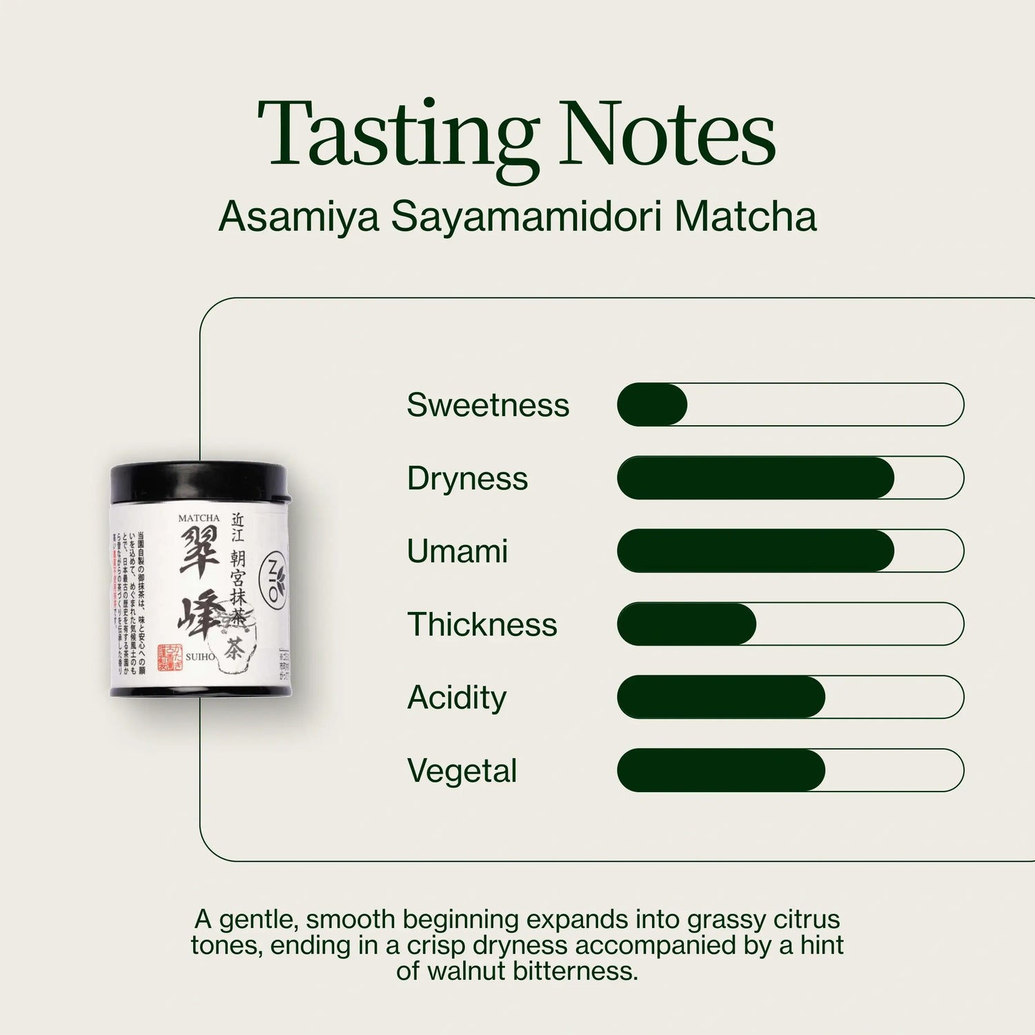 In order to evaluate the Asamiya Yabukita Matcha, we carefully assessed both its texture and flavor. We considered its potential for dryness, sweetness, minerality, or acidity and examined its thickness and richness, or mouthfeel. Finally, we took note of the vegetal flavor, a consistent profile across all types of matcha, to gain a thorough understanding of this particular variety.