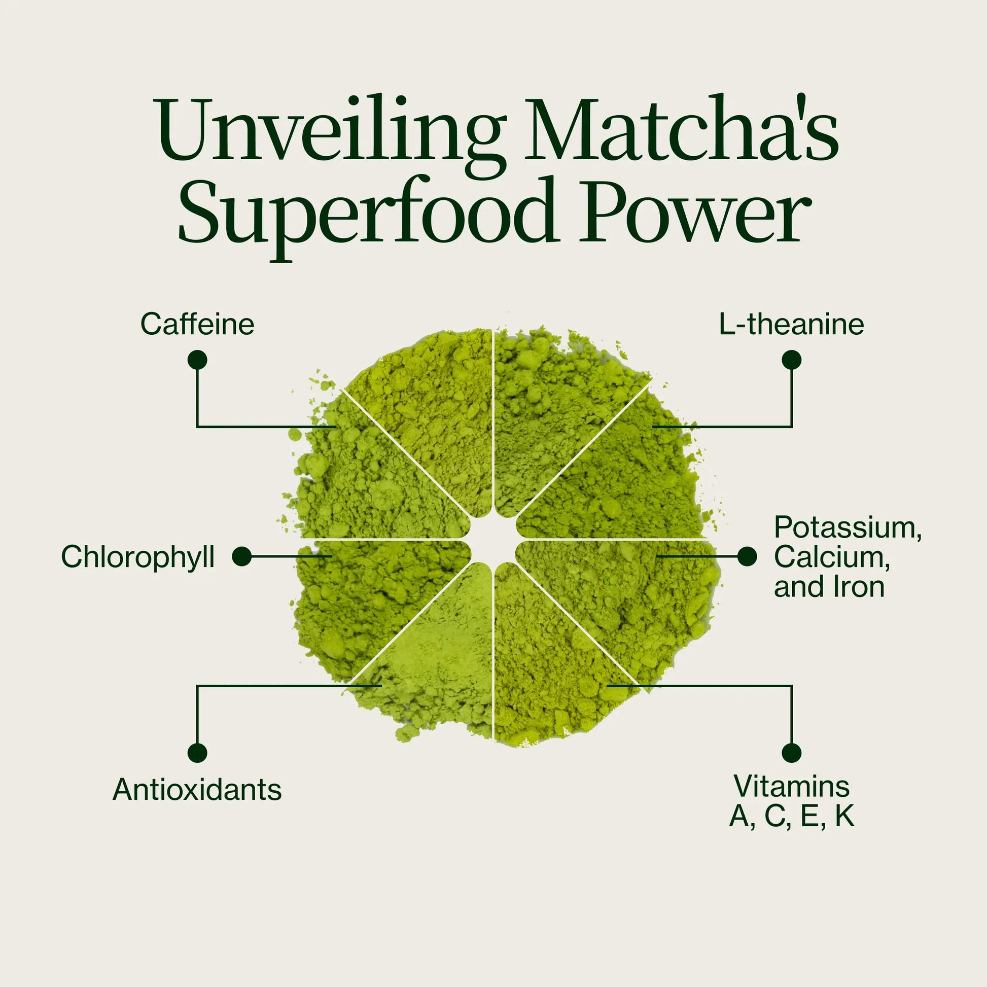 Matcha er fyldt med kraftige antioxidanter, naturlig koffein og beroligende aminosyrer, der giver vedvarende energi, mental klarhed og en følelse af rolig fokus. Det understøtter det generelle velbefindende, øger stofskiftet og fremmer et sundt immunsystem, hvilket gør det til det perfekte supplement til din daglige rutine eller dit feriemønster.