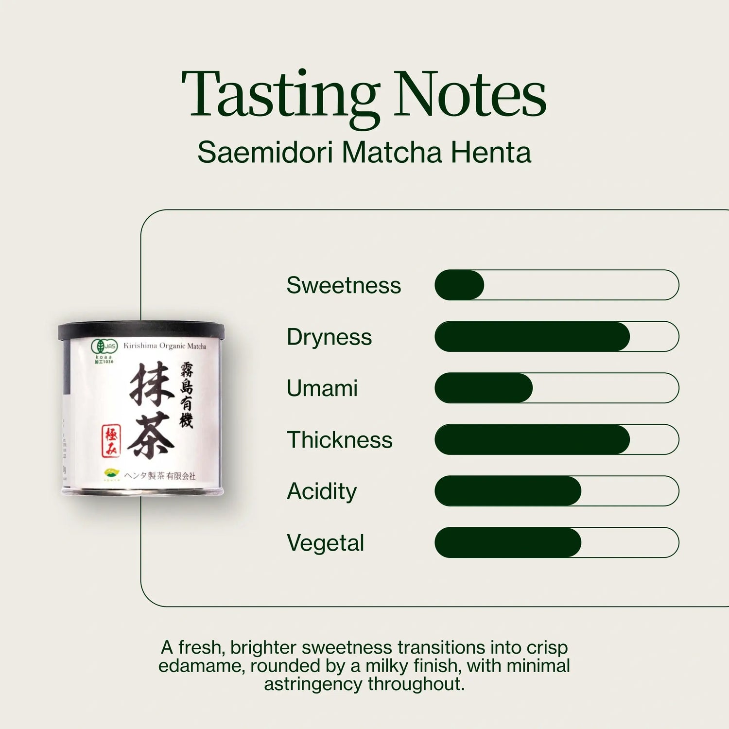 The Saemidori Matcha Henta is a smooth and sweet matcha tea produced by Mr. Henta in the Kirishima region and it’s well liked for its light sweet taste