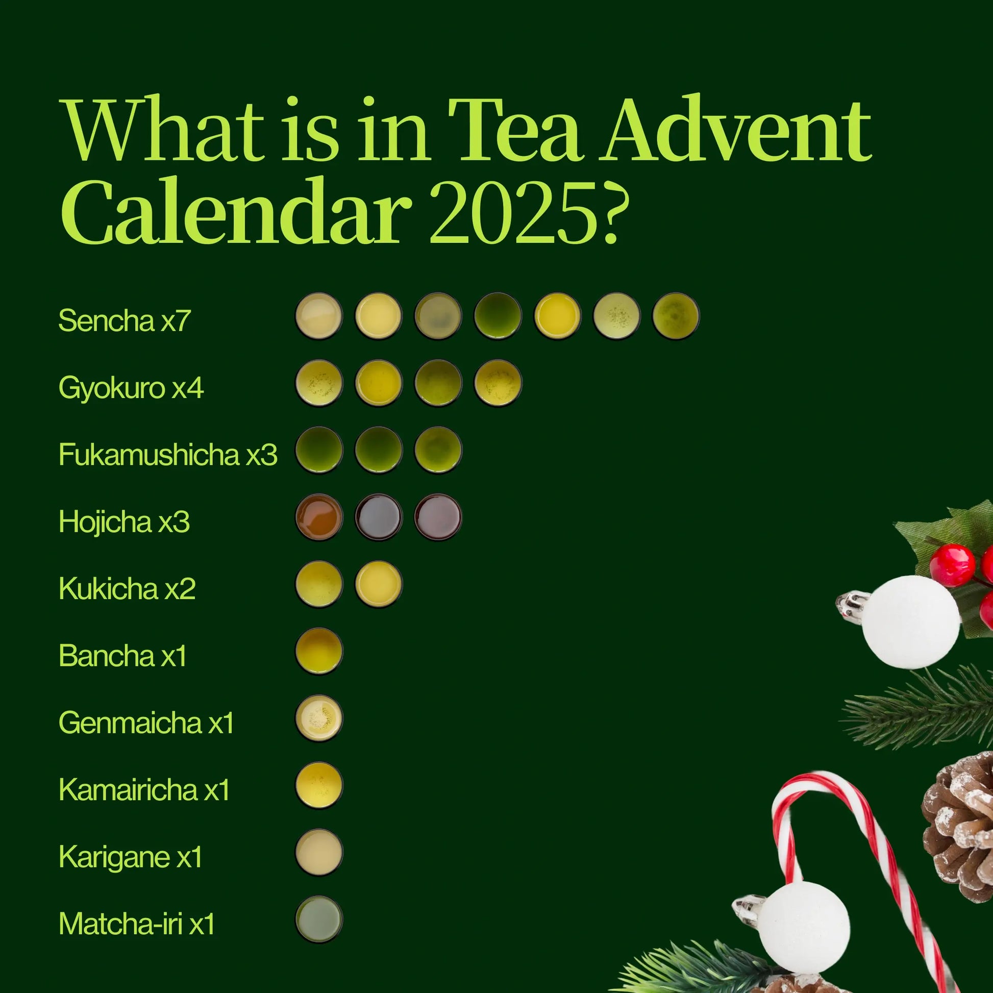 Denne adventskalender med løs te byder på en række af Japans mest ikoniske teer, fra forfriskende sencha til rig gyokuro, ristet hojicha og meget mere. Oplev også sjældne teer som fukamushi sencha, kukicha, bancha, genmaicha, kamairicha, karigane og matcha-iri.